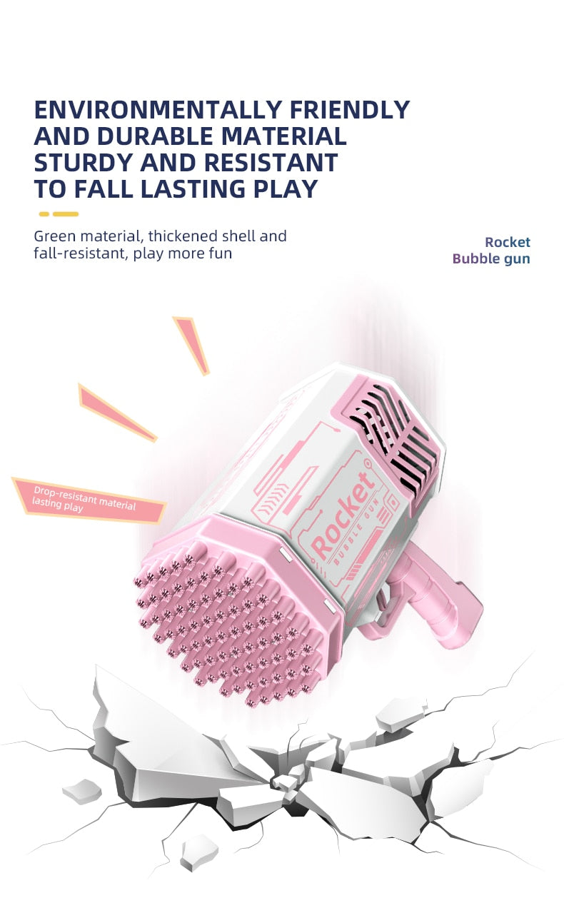 The Bazooka Bubble Gun has 69 bubble holes and 10,000 BPM (Bubbles per minute), which can blow hundreds of bubbles at a time.