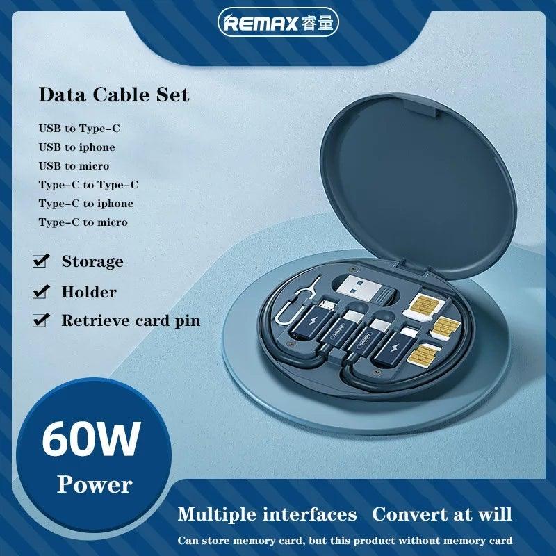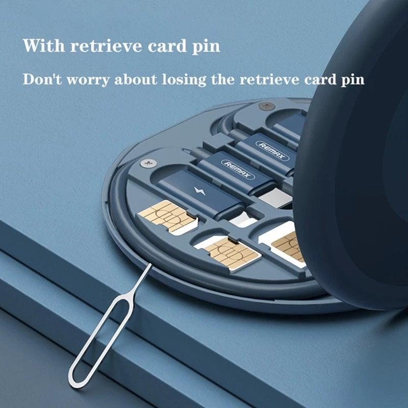 It has four different ports: Android, lightning, USB, and a TYPE C cable that you can convert it into the type of port you need for data transmission & charging. It is a convenient storage box for various types of interfaces, SIM cards, data cable. It also comes with an eject pin and 3 card slots, which you can store after you pick up the card to prevent SIM card loss.