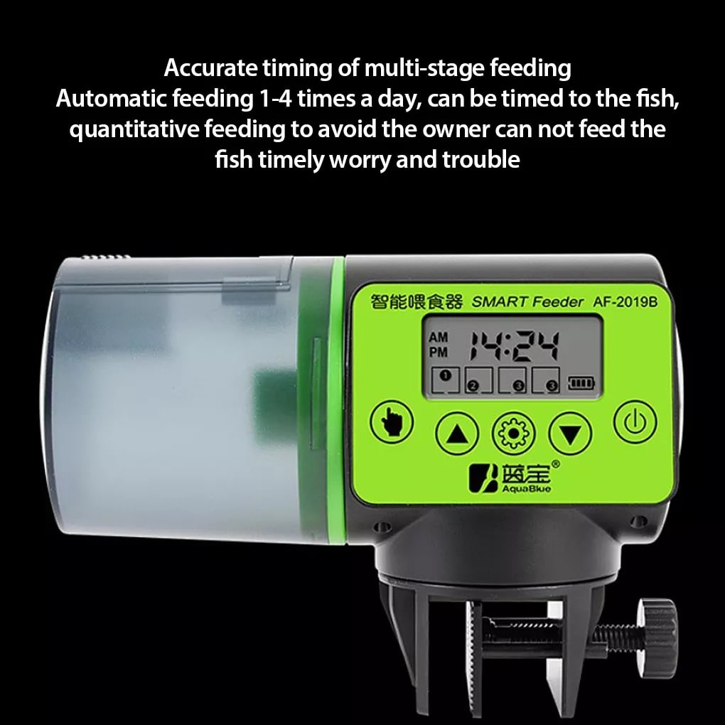 FEATURES: The Fish Feeder allows you to set up to four automatic feedings per day. You can program it to feed at any hour of the day or night and have it deliver either a single or double or triple feeding. At the same time, you can also feed manually and experience the fun of feeding.