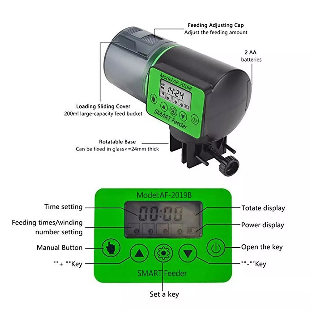 - LARGE CAPACITY: With a capacity of 200ml, its large size holds enough food to keep your fish fed while you’re away. Hatch style feed door is completely adjustable, allowing you to decide how much food is dispensed at each meal.