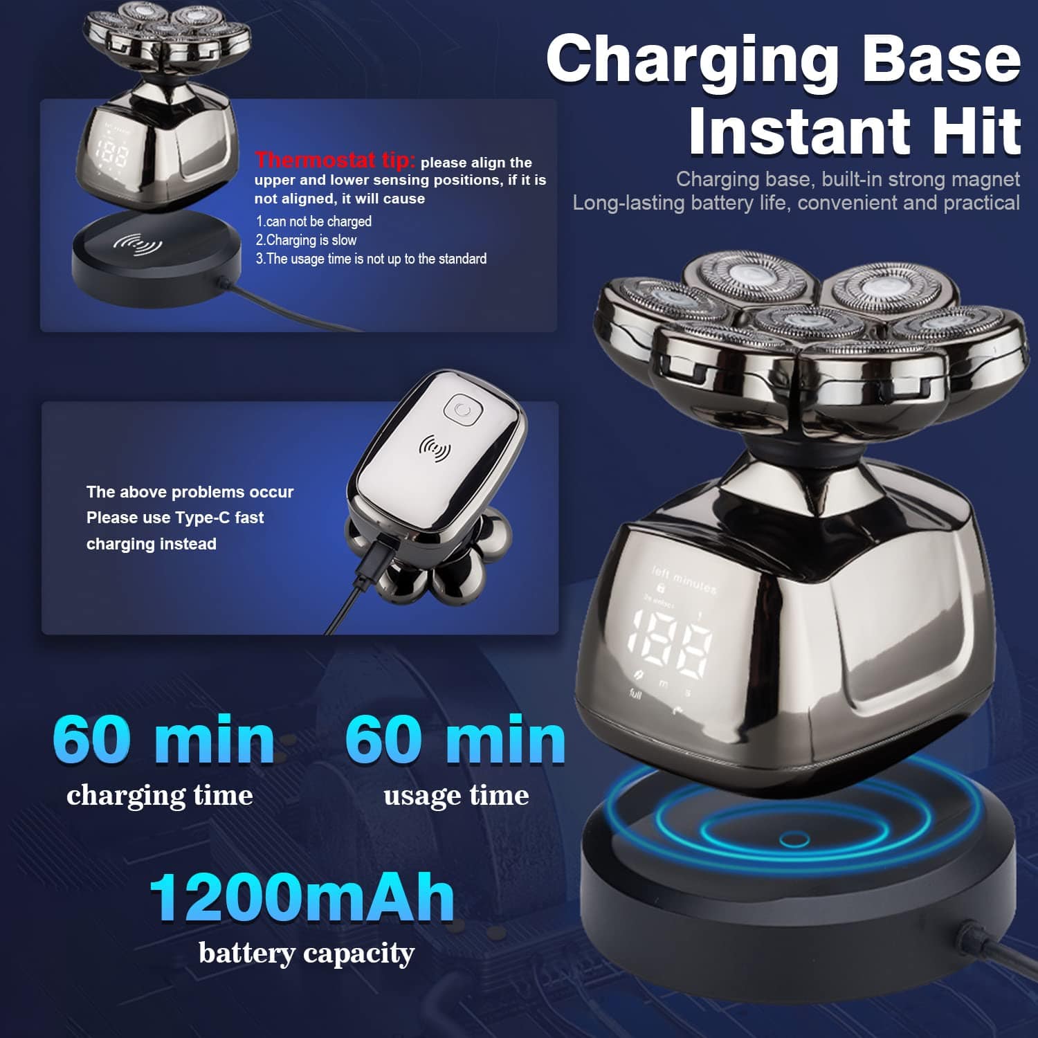 Equipped with a wireless charging dock and USB port, the bald head shaver for men offers you multiple charging methods. 2 hours fully charged for 90 minutes of continuous use. The LED display makes Low battery reminder/ water washing reminder more intelligent.