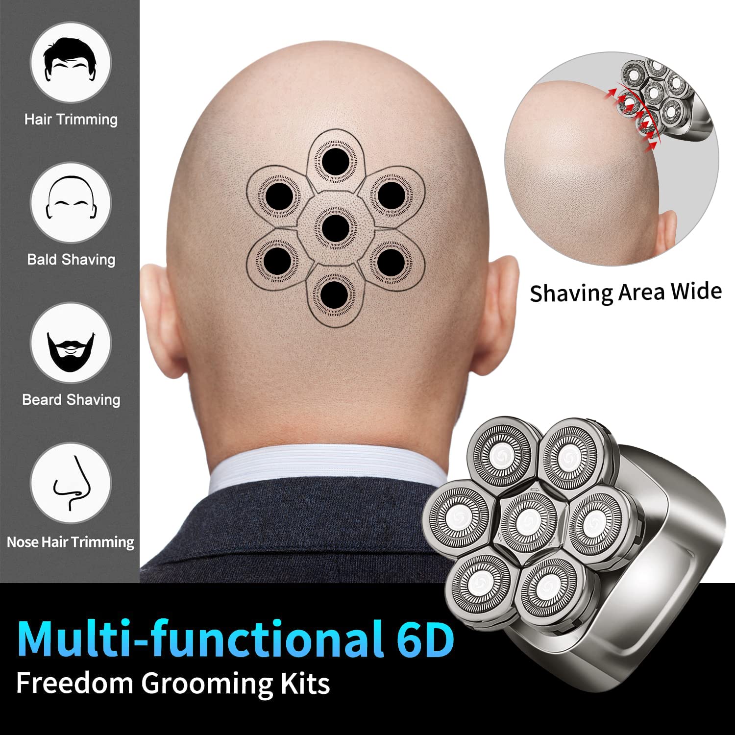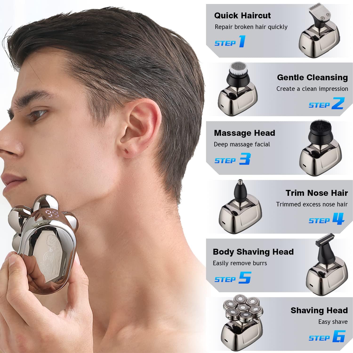 Electric shaver for men has 6 detachable attachments. 7D/5D shaver head can be used for men's bald head; hair clipper with 3/5/7mm guide combs for different hair & beard styling; beard trimmer; nose & hair trimmer; facial cleansing and facial massage brush. Grooming Kit meets all your personal facial and body shaving care.