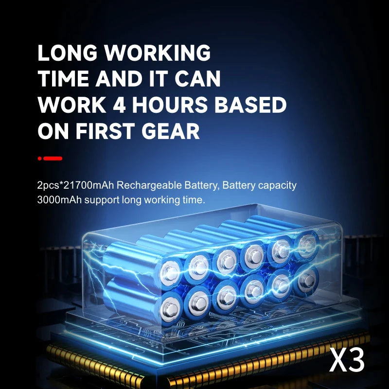 Attention: The genuine X3 upgraded violent turbofan adopts a brushless DC high-speed motor, with a maximum output speed of 130000 RPM, which can generate super strong wind speeds of up to 52 meters per second, equivalent to a level 16 typhoon. It has strong power, long-lasting stability, and does not burn the machine under long loads. It also has charging protection and overheating protection functions, with an ultra long battery life of up to 4 hours in one gear. It has two 217000 built-in batteries with a battery capacity of 3000mAh, making it more durable to use! Three speed regulation provides you with a unique experience