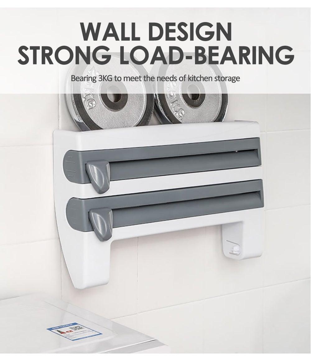 MULTI-FUNCTION & EASY STORAGE: The multi-functional wall kitchen roll holder can store kitchen papers, plastic wraps, cling films and foil papers. Also, with storage shelf and film cutter design, strong practicality, is a perfect kitchen helper and tool.