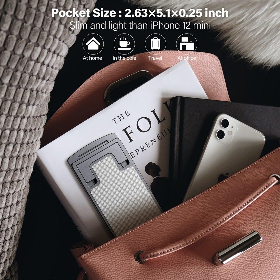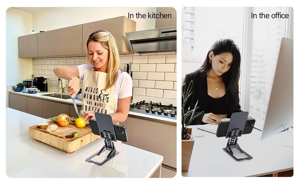 Despite being a support, it has a beautiful finish and it is all well done in details. Powerful, small & easy to store, that's what makes it practical and functional. The height adjustments are on point, and the rubberized bottom and front are well suited to prevent slipping. Suitable for your phone as well as your tablet. Soft to store and protect the material of your device.