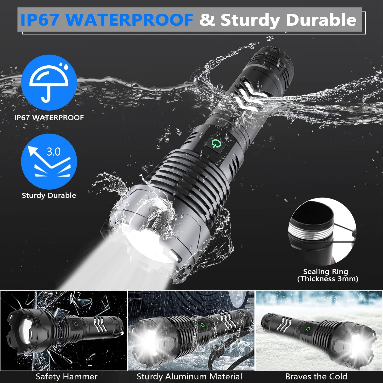 The IPX6 function allows you to use this flashlight in extreme weather. Perfect for camping, hiking, inspections etc.