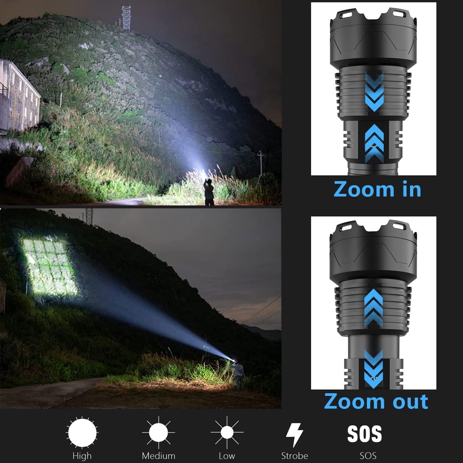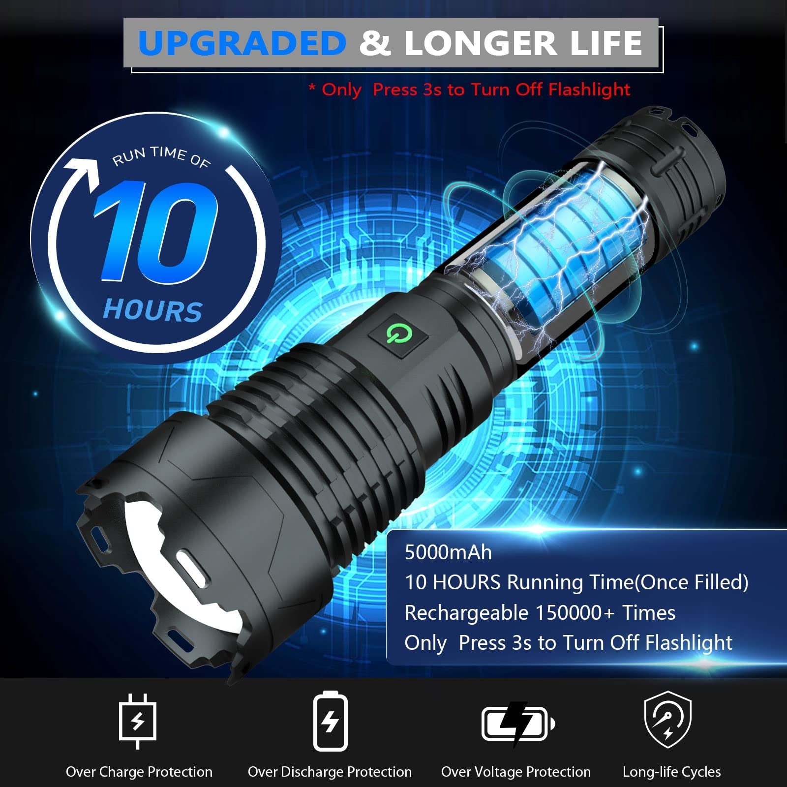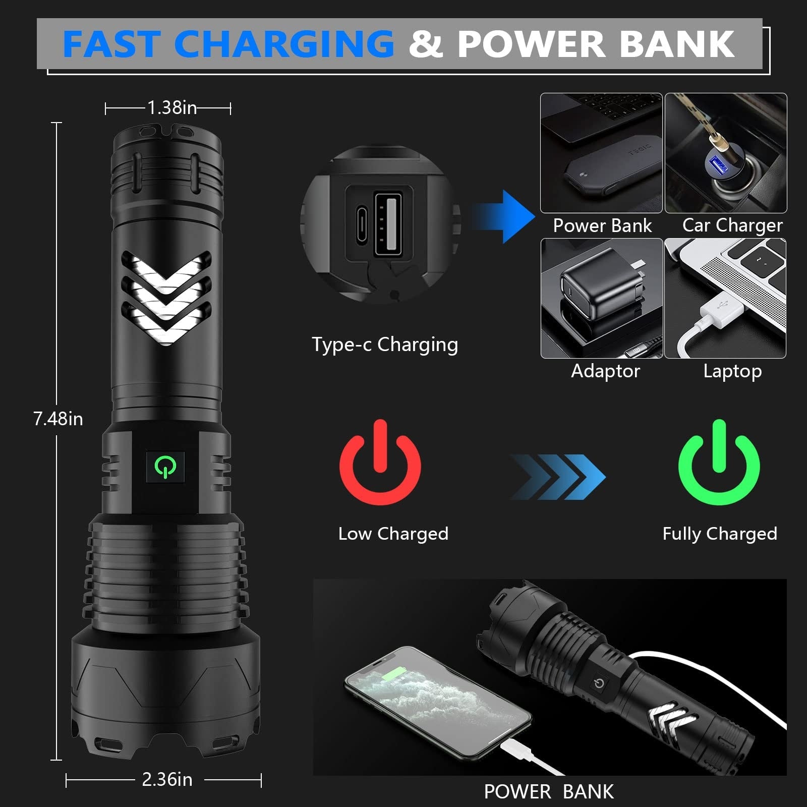 Use the rechargeable laser flashlight up to 72hours. The USB input port allows you to charge the flashlight and the USB output port makes this flashlight work as a emergency power bank to charge your phone, camera etc.